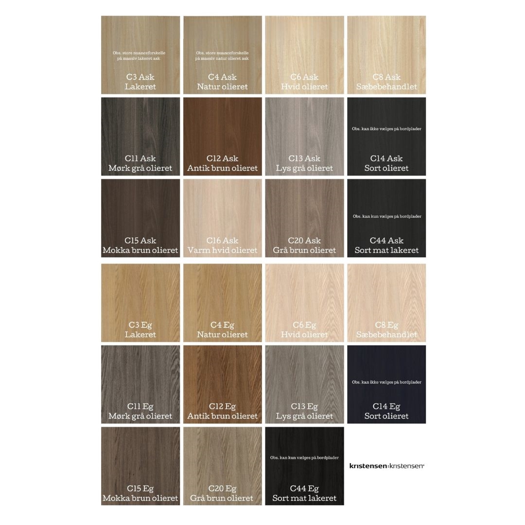 Ant sofabordet fås i massiv eg eller ask, og kan vælges i flere størrelser og varianter. Bordpladen har en tykkelse på 3 cm.