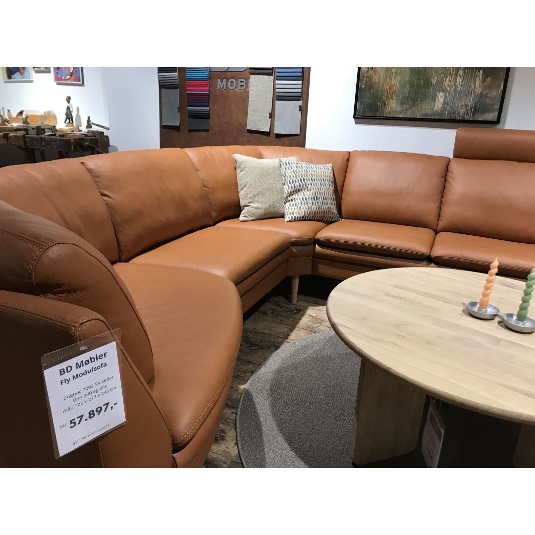 Fly hjørnesofaen fra BD er en super lækker og eksklusiv sofa, der kombinerer moderne design med høj komfort. Den er betrukket med cognacfarvet læder 7002 SV, som giver sofaen en varm og elegant karakter. Læderets naturlige struktur og dybe farve tilfører rummet personlighed og patinerer smukt over tid.
