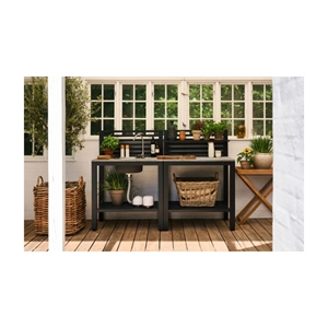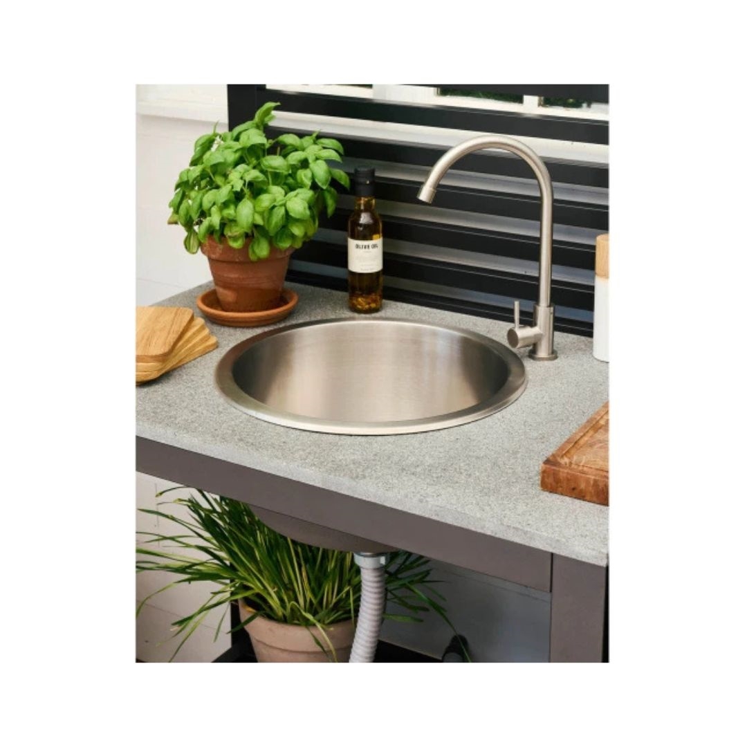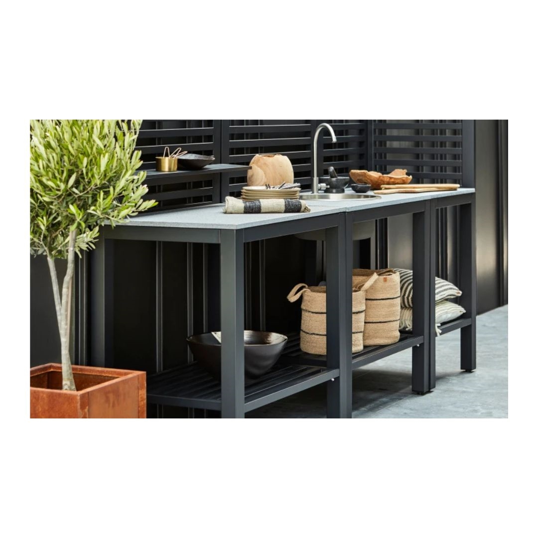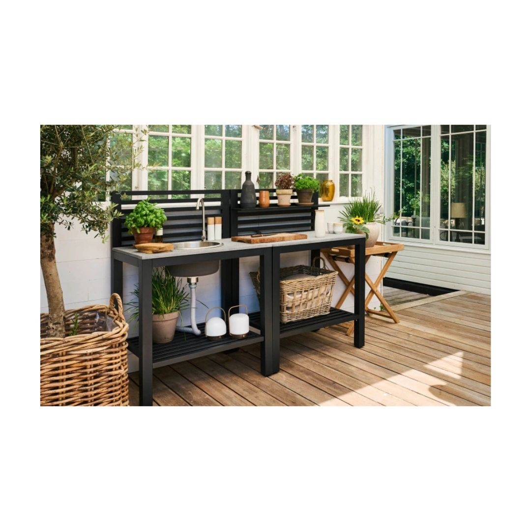 Bellac udekøkken er til dig, der gerne vil bruge mere tid udendørs – ikke kun ved grillen, men også til forberedelse, servering og de små pauser imellem. Her får du et udekøkken, der samler det hele ét sted og giver en rolig og praktisk ramme om udelivet. Konstruktionen i aluminium gør køkkenet både let og stabilt, samtidig med at materialet er ideelt til udendørs brug. Den solide bordplade i granit giver en robust og slidstærk arbejdsflade, som er nem at rengøre og behagelig at arbejde ved. Kombinationen af sort aluminium og grå granit skaber et moderne og roligt udtryk, som passer ind på de fleste terrasser og i uderum. Den integrerede vask og vandhane gør det let at skylle grøntsager, vaske hænder eller gøre klar til næste servering uden at skulle gå indenfor.