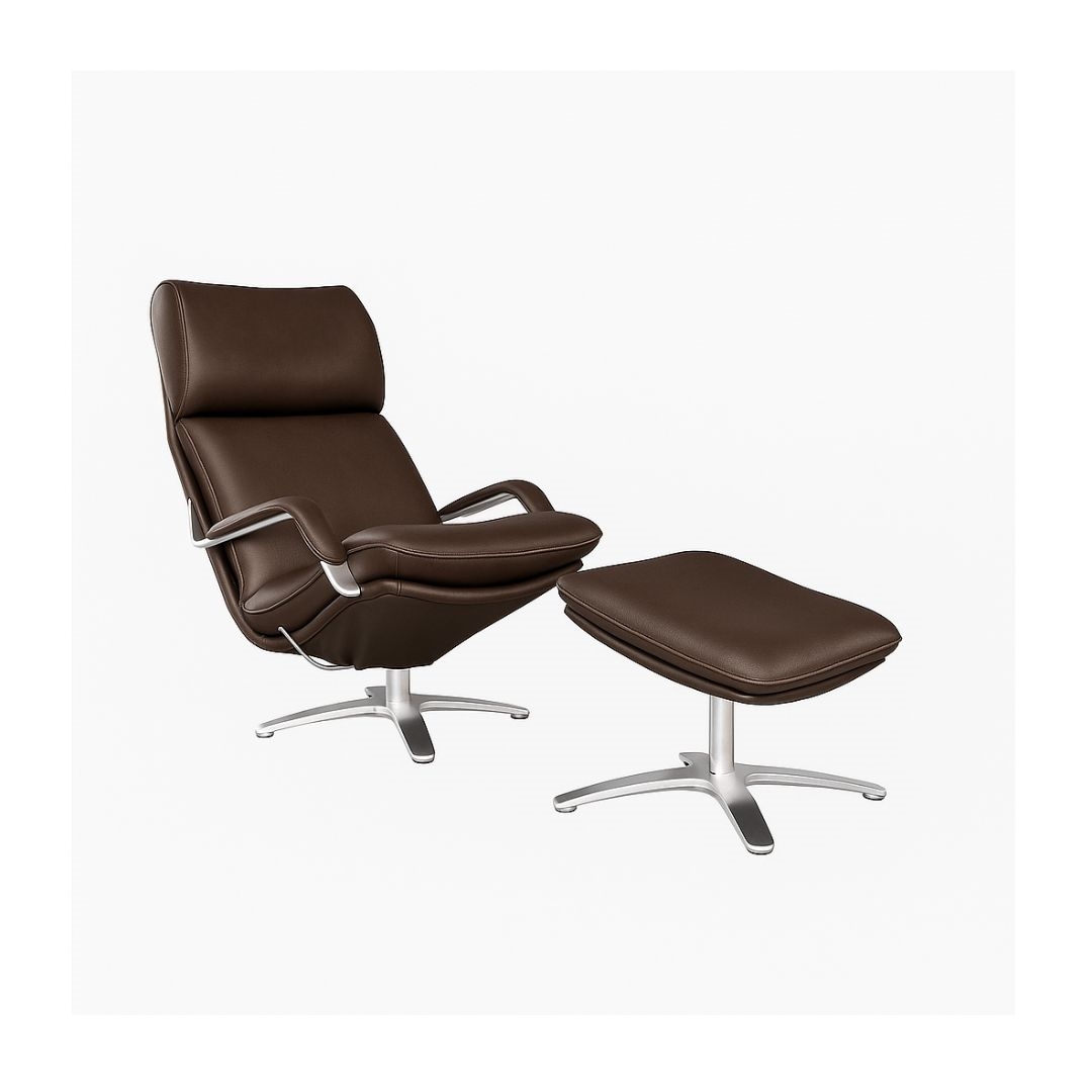 Den trinløse vippefunktion aflaster kroppen i alle positioner, mens nakkestøtten kan justeres præcist efter behov. Kombinationen af kvalitetslæder i farven Mokka, markante Aston-syninger og et stel i mat aluminium vidner om kompromisløst håndværk og materialer i topklasse.