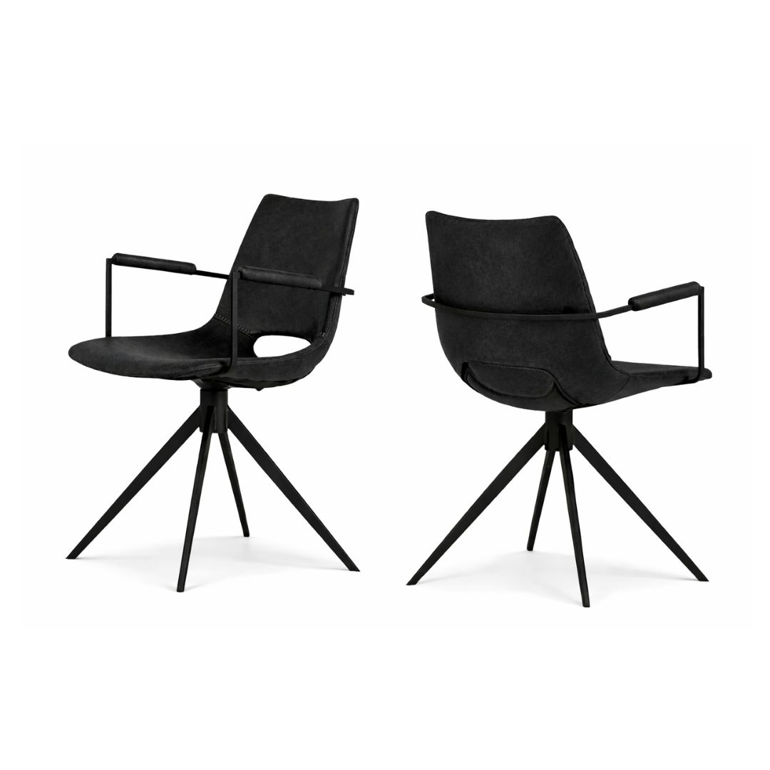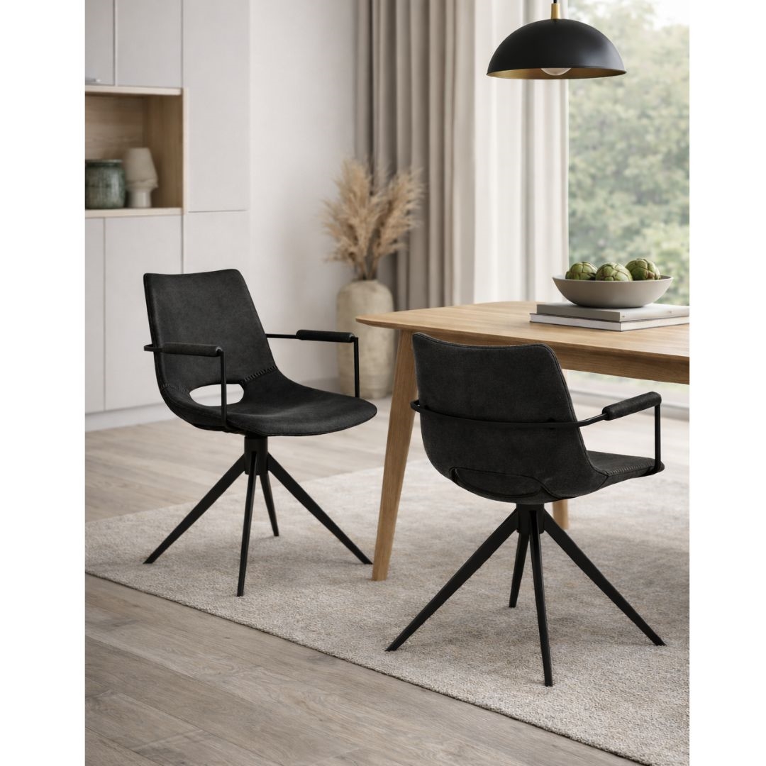 Det sortlakerede stålstel sikrer høj stabilitet og lang holdbarhed og understreger stolens moderne udtryk. Kombinationen af slidstærkt mikrofiberbetræk, drejefunktion og armlæn gør Cayman til en funktionel og komfortabel spisebordsstol, der passer perfekt ind i både moderne og klassiske hjem.