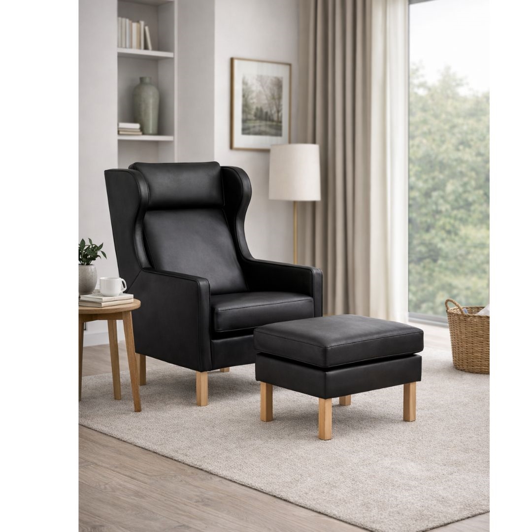 Cerena øreklapstol og fodskammel – Klassisk komfort i sort okselæder