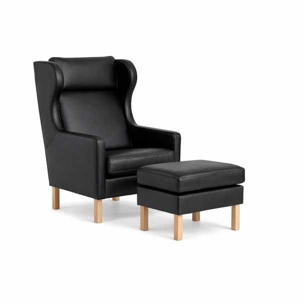 Den medfølgende fodskammel fuldender komfortoplevelsen og giver mulighed for at strække benene og opnå en afslappet siddestilling. De massive, sæbebehandlede egetræsben tilfører varme og naturlighed og står smukt til det sorte læder.