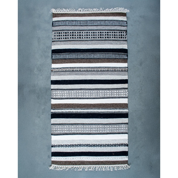 De varme, naturlige farvetoner og de detaljerede mønstre giver tæppet en indbydende stemning, som harmonerer smukt med mange forskellige indretningsstile. De dekorative frynser langs kanterne tilfører et særpræg og fremhæver tæppets håndlavede kvalitet.
