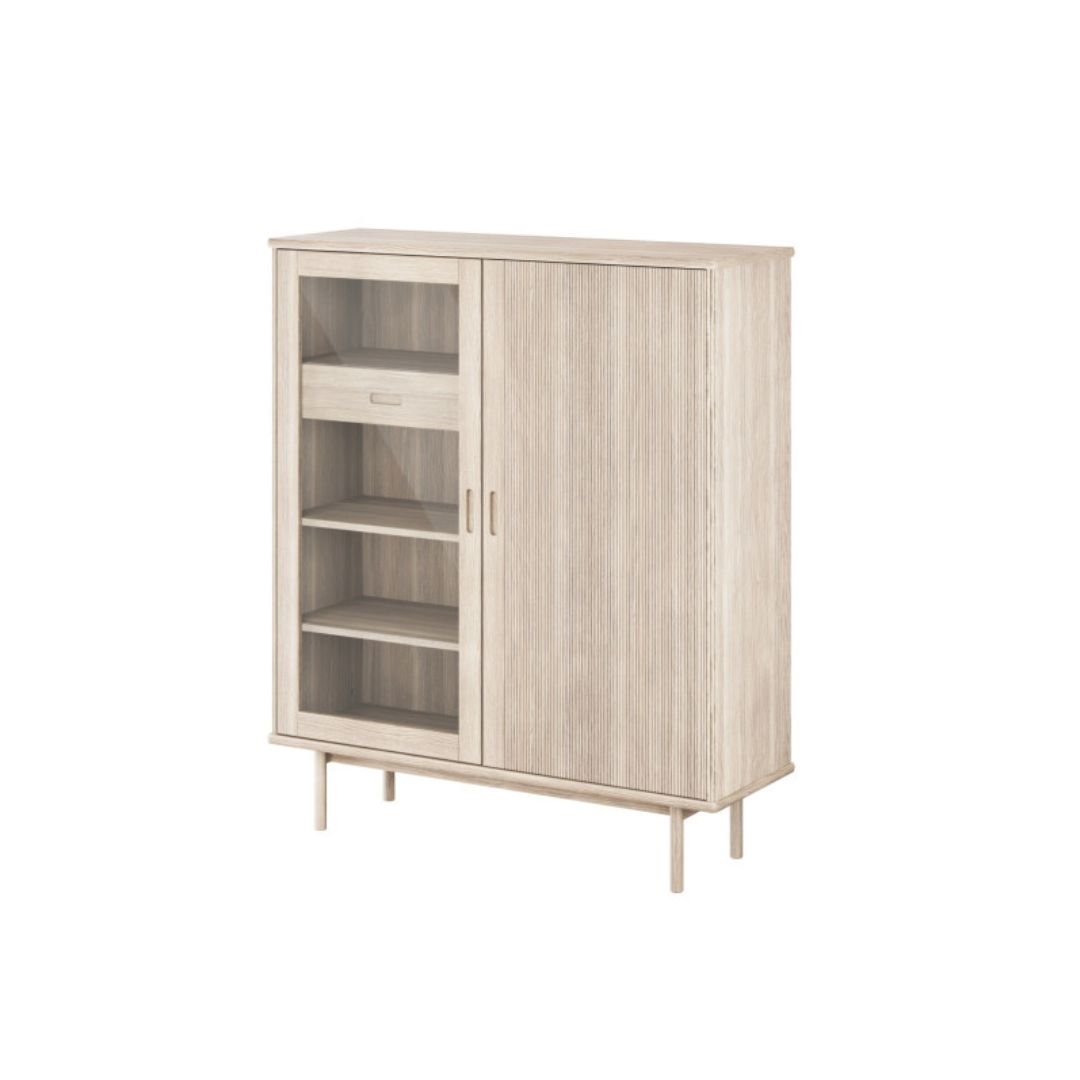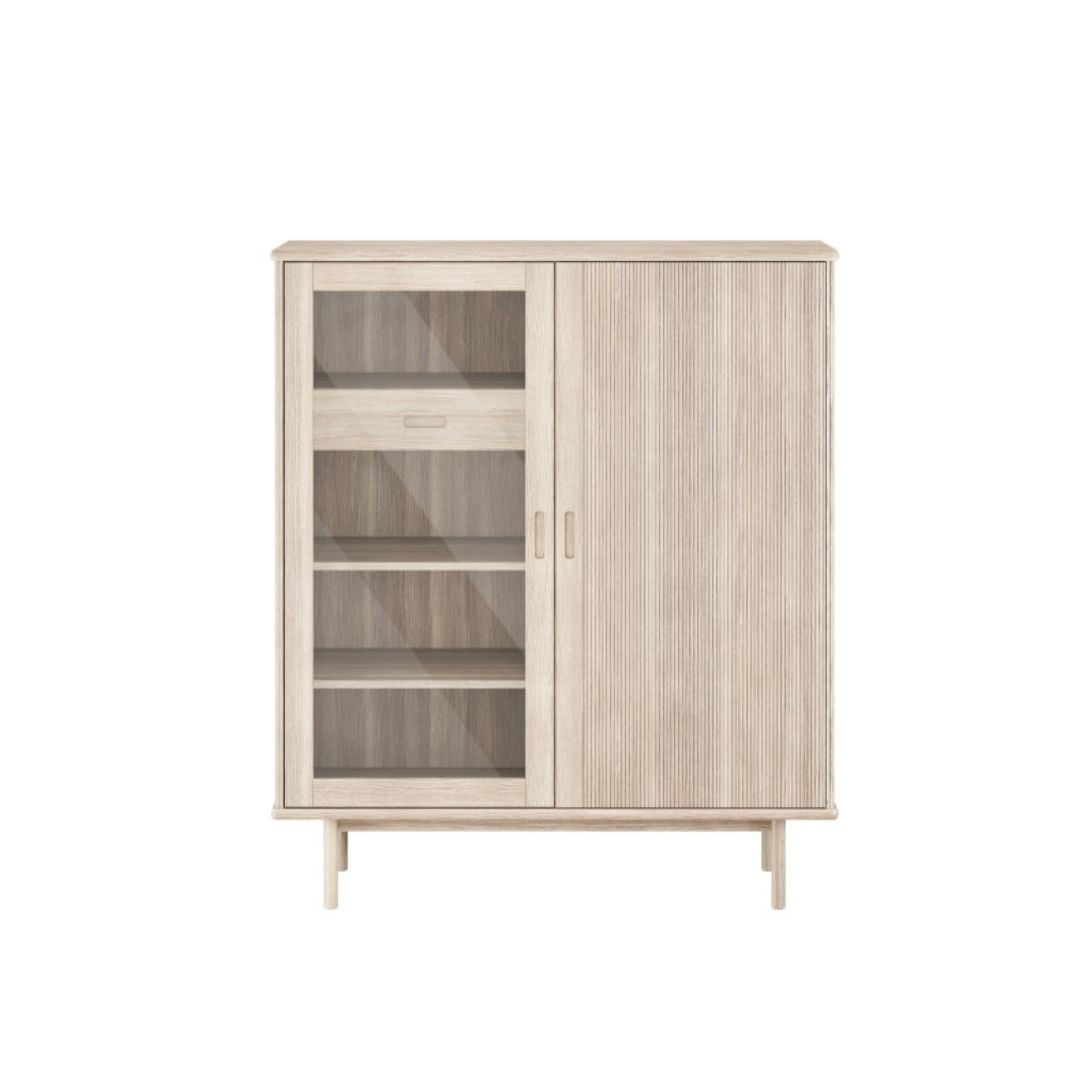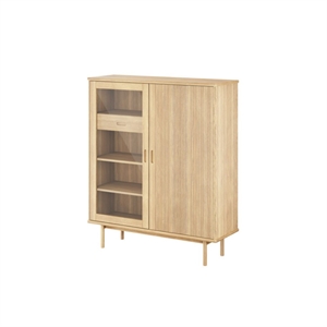 Highboardet er funktionelt indrettet med to låger – én med rillede træfronter og én med glas – begge med soft-close lukning. Indvendigt gemmer der sig en skuffe til ekstra opbevaring samt tre hylder, hvoraf to er justerbare. Det giver dig fleksible muligheder for at indrette skabet efter behov.