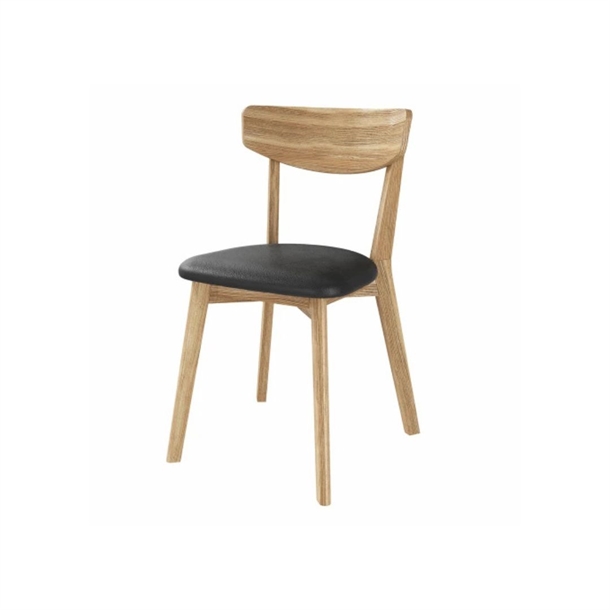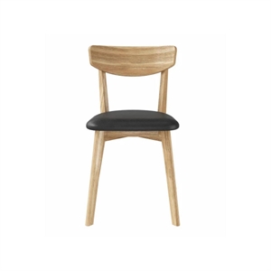 Stolen er vist med sæde i sort læder og ryglæn i formspændt egefiner. Den fås i naturolieret eg og hvidolieret eg, så du kan tilpasse udtrykket til netop din stil.