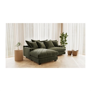 Glasgow sofa med chaiselong er til dig, der ønsker en sofa med et lækkert design og komfort i topklasse. Sofaens voluminøse sæde- og ryghynder giver et indbydende udtryk og gør den ideel til afslapning i hverdagen. Sædehynderne er opbygget med koldskum toppet med siliconefiber samt dun og fjer, hvilket giver en behagelig kombination af støtte og blødhed. Ryghynderne indeholder et mix af siliconefiber og dun/fjer, som gør det ekstra komfortabelt at læne sig tilbage. Med sin brede chaiselong får du god plads til at strække benene og nyde rolige stunder, hvad enten du ser film, læser eller samler familie og venner. Konstruktionen i solidt træ sikrer samtidig en holdbar sofa, der kan bruges dag efter dag.