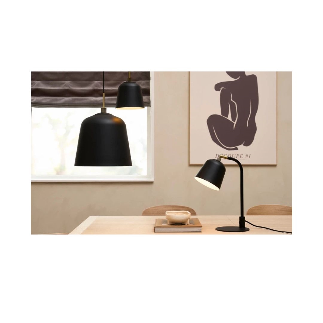 Room 49 bordlampe kombinerer klassisk design med moderne detaljer. Lampen er fremstillet i sort sprøjtelakeret metal med en mat finish, som giver et roligt og tidløst udtryk. Det antique messing ved lampehovedet tilføjer karakter og kant til lampens harmoniske form. Den præcist laserskårne skærm giver et gennemført og stilrent udtryk, der passer ind i både klassiske og moderne hjem.