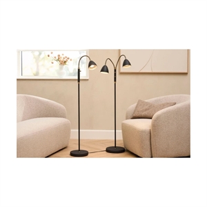 Room gulvlampe med to arme kombinerer moderne design med funktionalitet. Den matte sorte overflade og detaljer i antique messing giver lampen et elegant og tidløst udtryk, som passer ind i de fleste boligindretninger. De to justerbare lampehoveder gør det muligt at rette lyset præcist, så lampen kan bruges både til læsning, hyggekroge eller generel belysning i stuen. Den solide fod sikrer stabilitet, mens den lange stofledning gør det nemt at placere lampen fleksibelt i rummet.