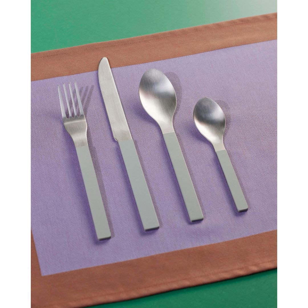 Bestiksættet består af fire dele: kniv, gaffel, spiseske og teske. Det er fremstillet i børstet rustfrit stål med greb i farvet lak, hvilket giver sættet et moderne, men varmt udtryk. Du kan vælge at bruge sættet i ensfarvet stil eller mikse farver for et mere legende og unikt udtryk ved bordet.