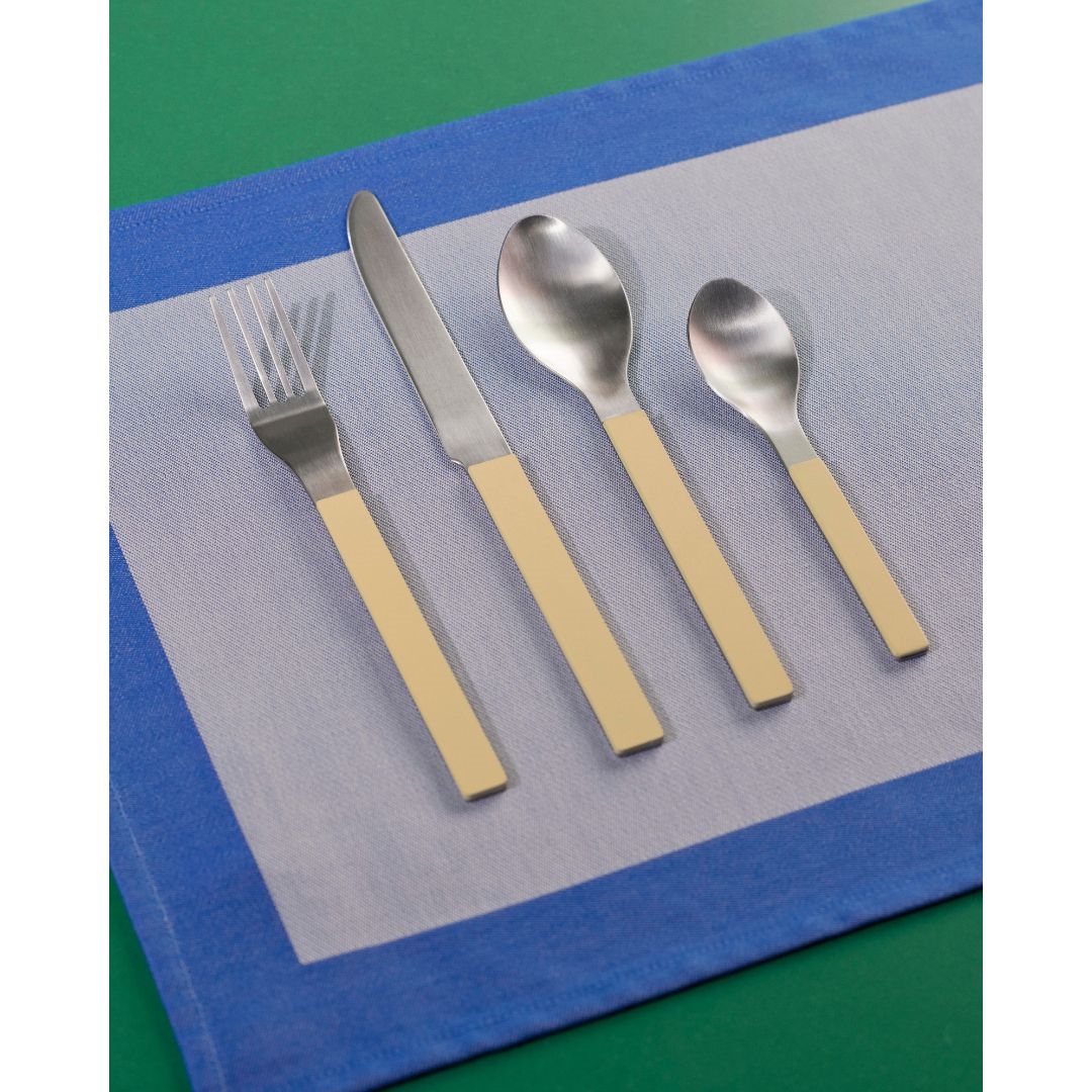 Bestiksættet består af fire dele: kniv, gaffel, spiseske og teske. Det er fremstillet i børstet rustfrit stål med greb i farvet lak, hvilket giver sættet et moderne, men varmt udtryk. Du kan vælge at bruge sættet i ensfarvet stil eller mikse farver for et mere legende og unikt udtryk ved bordet.