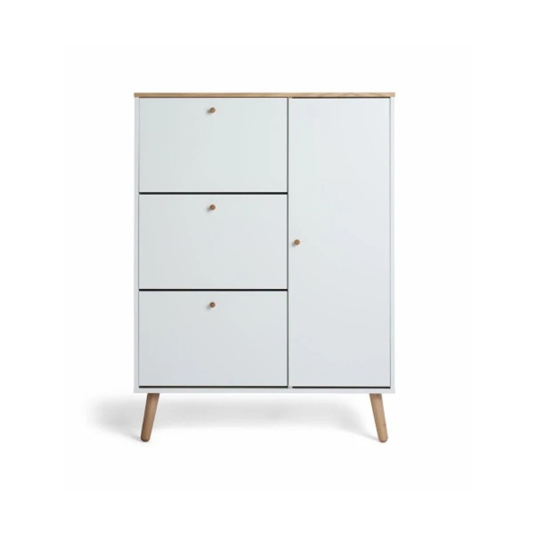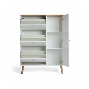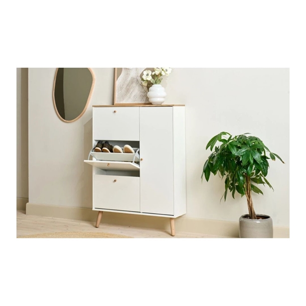 Hold orden med stil. Hub skoskab 1655 kombinerer funktionalitet med et rent, nordisk udtryk, der passer perfekt til moderne hjem. Det hvide korpus med detaljer i egetræsfinér giver et naturligt og varmt præg, mens de tre rummelige skuffer sørger for, at dine sko altid er organiserede og lette at finde, samt de 3 rum bag lågen giver ekstra opbevaring.