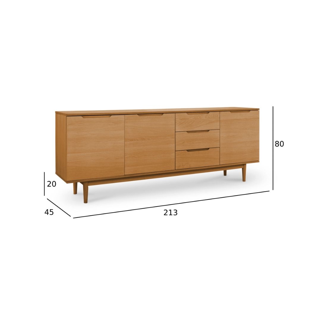 Kerteminde skænken i 213 cm er skabt til dig, der har brug for ekstra opbevaringsplads uden at gå på kompromis med kvalitet og design. Kombinationen af massivt træ, egefiner og MDF giver en solid og stabil konstruktion, der er velegnet til daglig brug. Den natur olierede overflade fremhæver egens naturlige struktur og tilfører varme og ro til rummet. Soft-close systemet i både låger og skuffer sikrer en behagelig og lydsvag betjening, mens de fræste greb understreger det enkle og elegante udtryk. Med fire låger, tre skuffer og justerbare hylder får du en fleksibel løsning, hvor alt kan organiseres overskueligt.