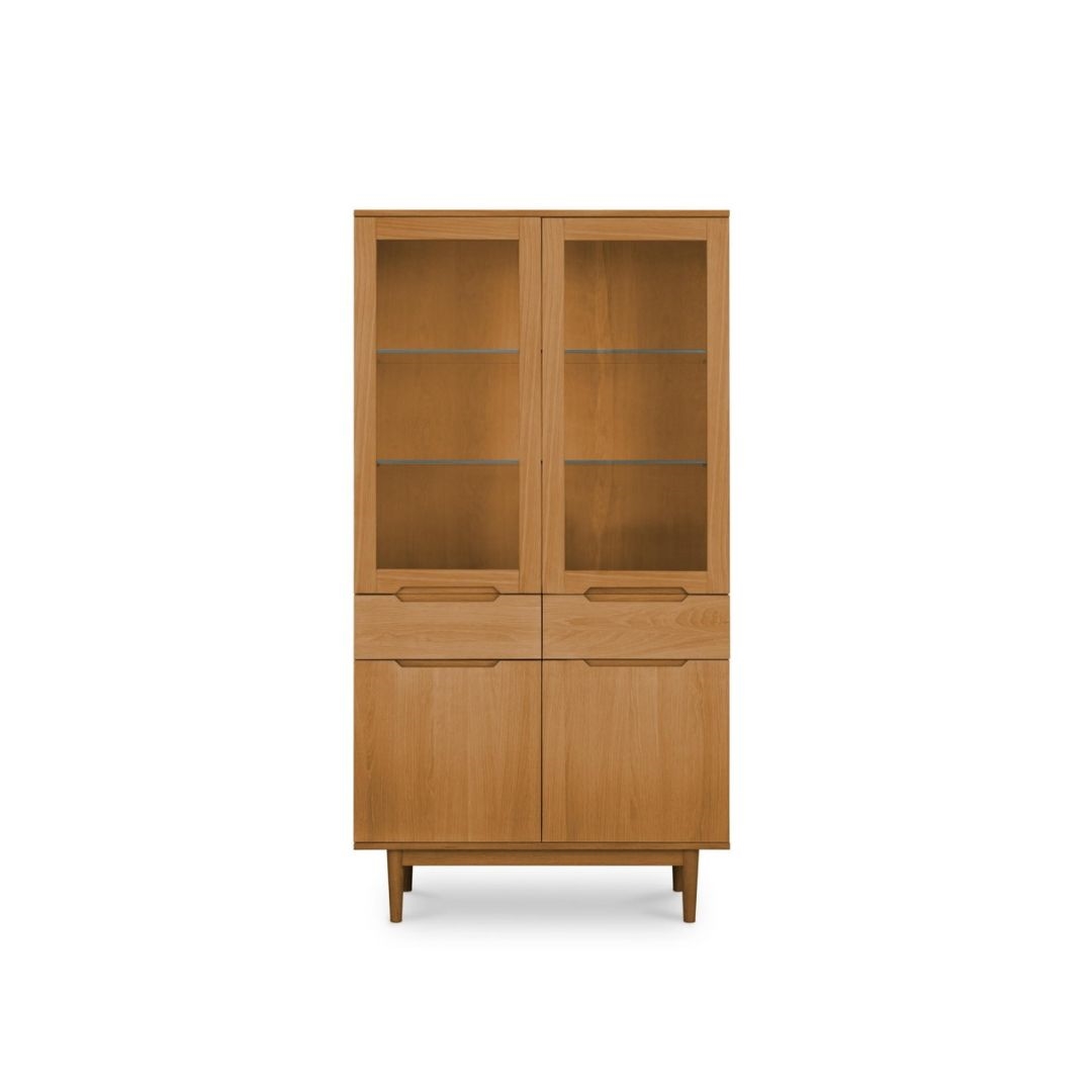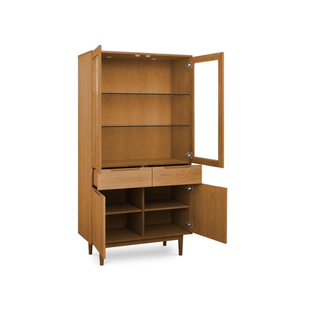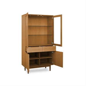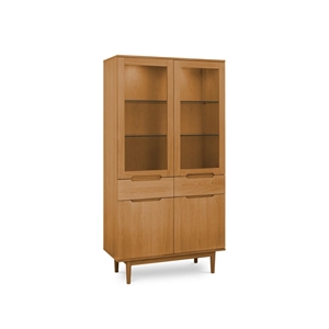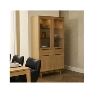 Med sin højde og afbalancerede proportioner fungerer vitrineskabet perfekt som et markant, men roligt element i stuen eller spisestuen. Brug glashylderne til glas, service eller dekorative genstande, og træhylderne til mere praktisk opbevaring. De slanke træben giver møblet et let udtryk og gør rengøringen nem. Kerteminde vitrineskabet kan nemt kombineres med andre møbler i serien og bidrager til en harmonisk og sammenhængende boligindretning med fokus på kvalitet og æstetik.
