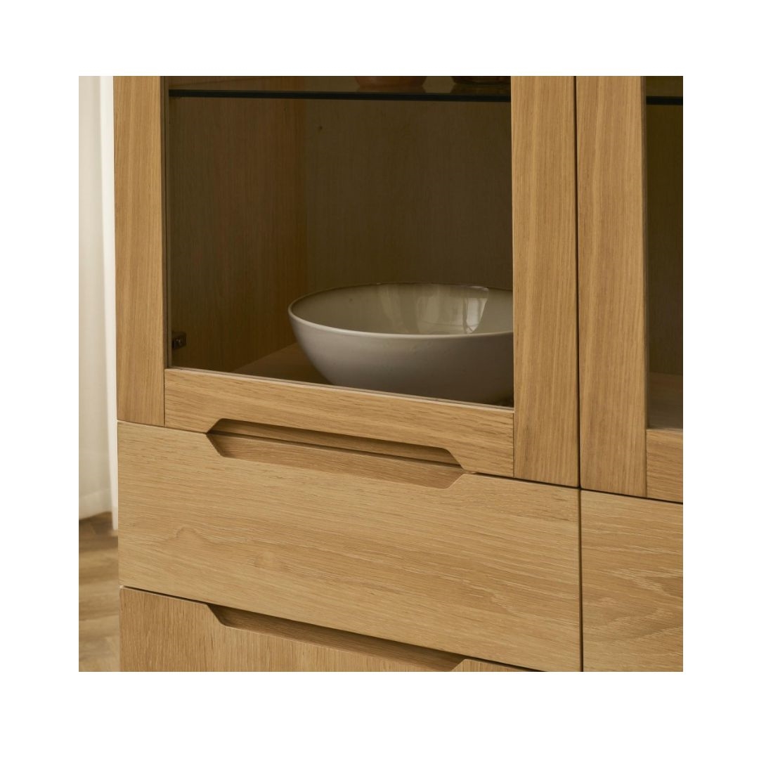 Kerteminde vitrineskabet er skabt til dig, der ønsker et møbel med både funktionel opbevaring og et elegant, tidløst udtryk. Den solide konstruktion i massivt træ, egefiner og MDF sikrer høj stabilitet og lang holdbarhed. Den natur olierede overflade fremhæver egens smukke struktur og giver skabet et varmt og roligt udtryk. Soft-close systemet i både låger og skuffer sikrer en behagelig og lydsvag betjening, mens de fræste greb understøtter det stilrene design. Kombinationen af træ- og glashylder giver fleksibel opbevaring, og det integrerede LED-lys fremhæver indholdet på en diskret og indbydende måde.