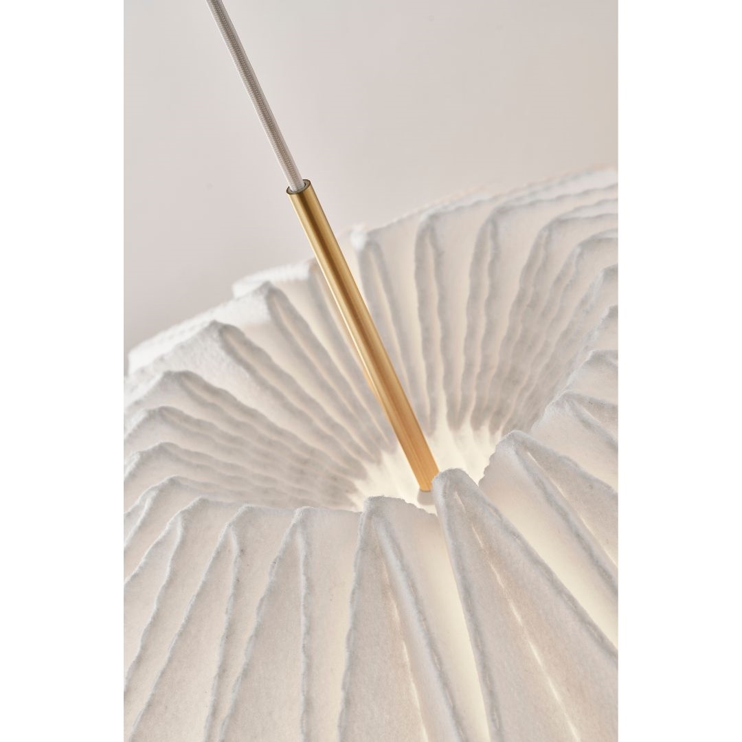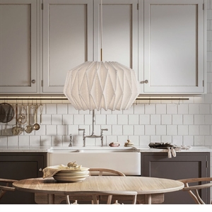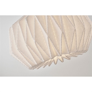 Le Klint 164 Softly Pleated I – Medium er en imponerende pendel designet af Philip Bro Ludvigsen. Lampen er fremstillet i håndfoldet filt og forener Le Klints stolte håndværkstraditioner med et nutidigt udtryk. Med sin større diameter på 62 cm er denne model ideel til rum, hvor lampen gerne må gøre indtryk – eksempelvis over spisebordet, i stuen eller i foyeren.