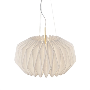Denne XL-model er oplagt til større rum, hvor både belysning og visuel tilstedeværelse spiller en central rolle. Den håndfoldede filt skaber et blødt og organisk udtryk, mens præcise perforeringer og folder tillader lyset at strømme igennem med et varmt, stemningsfuldt skær.