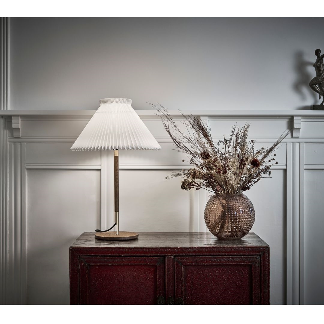 Le Klint Model 328 er en moderne bordlampe med tydelig forankring i klassisk dansk design. Lampen kombinerer naturens varme udtryk med æstetisk præcision: Den elegante lampefod er udført i røget eg, og forbindes med den karakteristiske håndfoldede lampeskærm via en raffineret messingdetalje. Resultatet er en lampe, der udstråler tidløs skønhed med et nutidigt twist.
