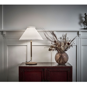 Model 328 er ikke blot en lyskilde, men et designobjekt. Den enkle, vertikale linje brydes diskret af messingforbindelsen ved foden, som fungerer som både funktionel og visuel signatur. Den medfølgende Le Klint Model 1 lampeskærm (27 cm) fuldender udtrykket med sin karakteristiske, plisserede form, foldet i hånden efter stolte danske traditioner.