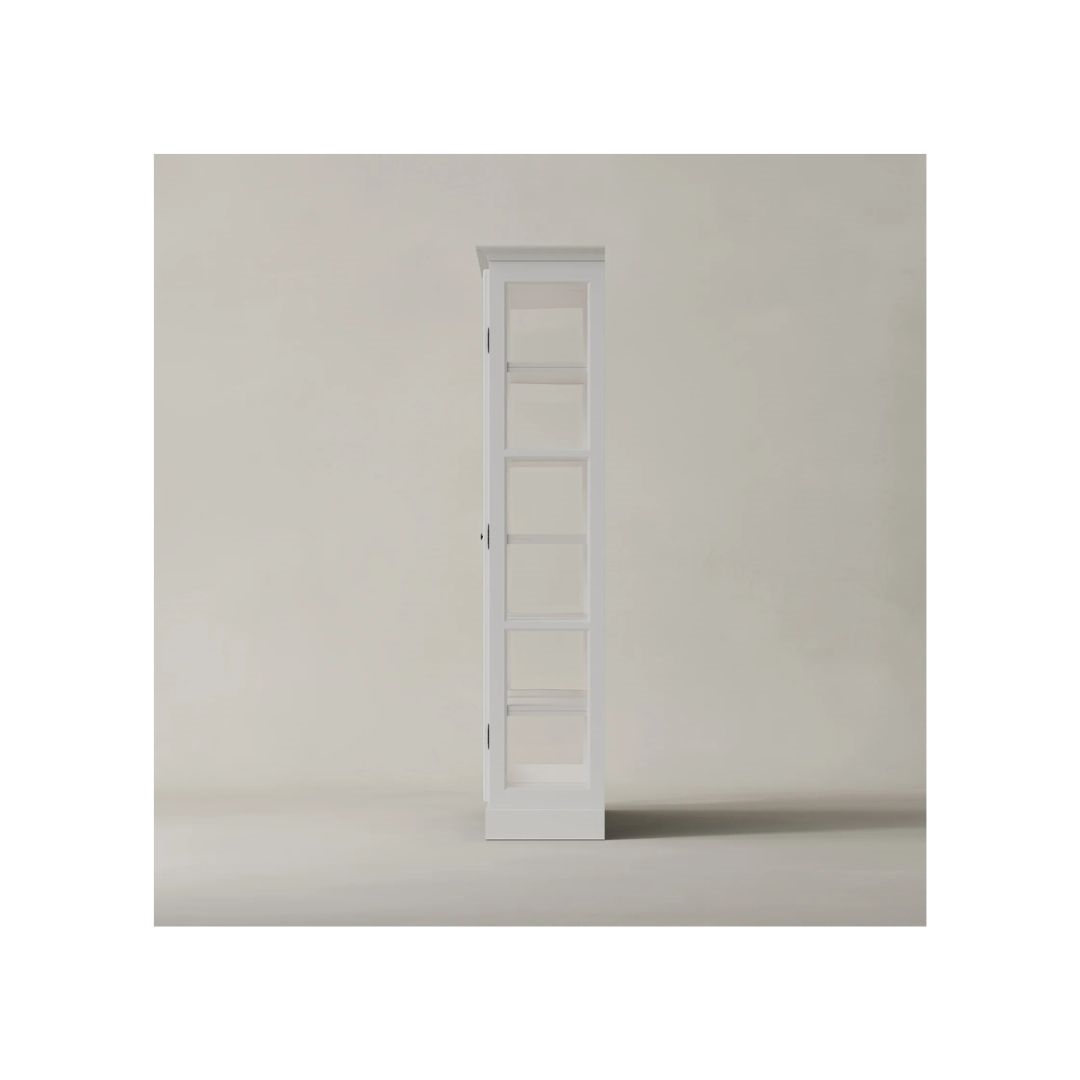 Lindebjerg Designs V2 vitrineskab er en smuk og klassisk opbevaringsløsning til hjemmet. Dette stilrene vitrineskab er udført i hvidmalet fyrretræ og omfavner det skandinaviske design med glas på alle sider, hvilket giver en let og elegant følelse i rummet. De ædle metalhængsler og greb tilføjer en sofistikeret finish, og den traditionelle top-profil gør vitrinen tidløs og passende i både moderne og klassiske indretninger.