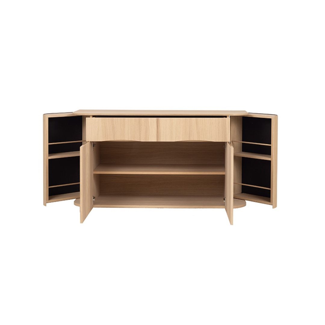 Det karakteristiske udtryk ses i de elegant buede låger, udført i smukt træfiner, som åbner let og lydløst takket være magnetlukning. Skabene er desuden udstyret med justerbare hylder og praktisk opbevaringsplads i begge sider, så du nemt kan tilpasse indretningen efter dine behov.