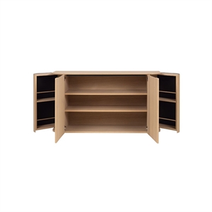 Et særligt kendetegn for Malli-serien er, at alle skabe er smukt fineret på alle sider. Det betyder, at møblerne ikke behøver at stå op ad en væg – de kan placeres frit i rummet som elegante rumdelere eller skulpturelle møbelpunkter. Skabenes ben er udført i massivt træ med justerbare fødder, så møblet står stabilt på alle typer gulve.