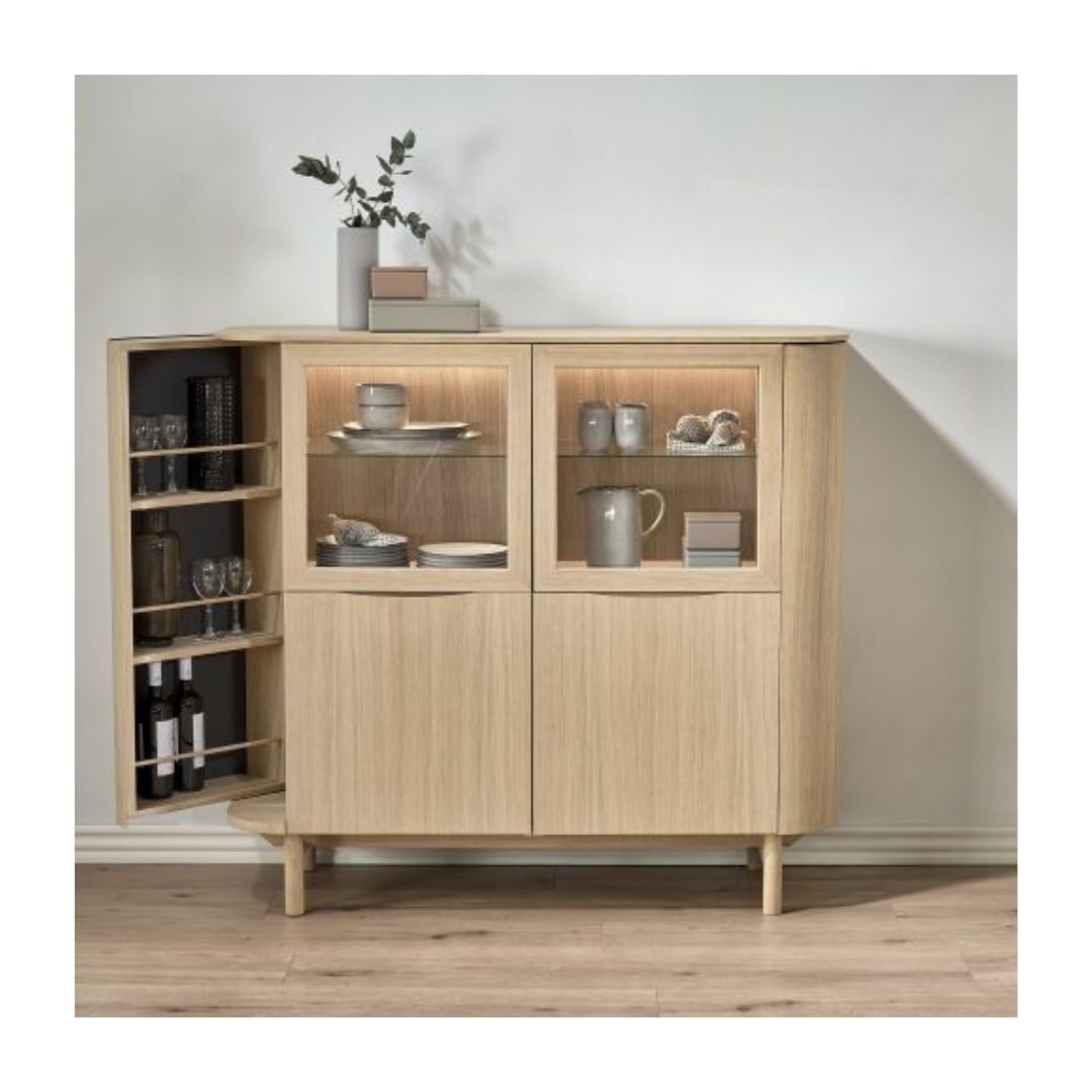 Det karakteristiske udtryk ses i de elegant buede låger, udført i smukt træfiner, som åbner let og lydløst takket være magnetlukning. Skabene er desuden udstyret med justerbare hylder og praktisk opbevaringsplads i begge sider, så du nemt kan tilpasse indretningen efter dine behov.