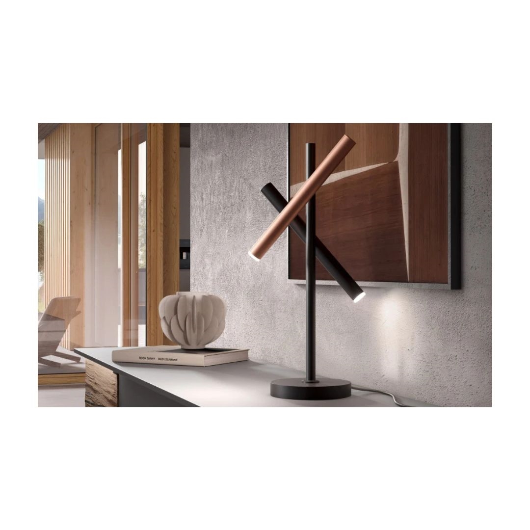 De to cylinderformede lampehoveder i farverne Sort og Coffee er arrangeret i en dynamisk, kunstnerisk opstilling, som giver lampen et eksklusivt og dekorativt udtryk. Den står smukt både som arbejdslys på skrivebordet, på en reol som et stilrent element eller som stemningsbelysning i stuen eller soveværelset.