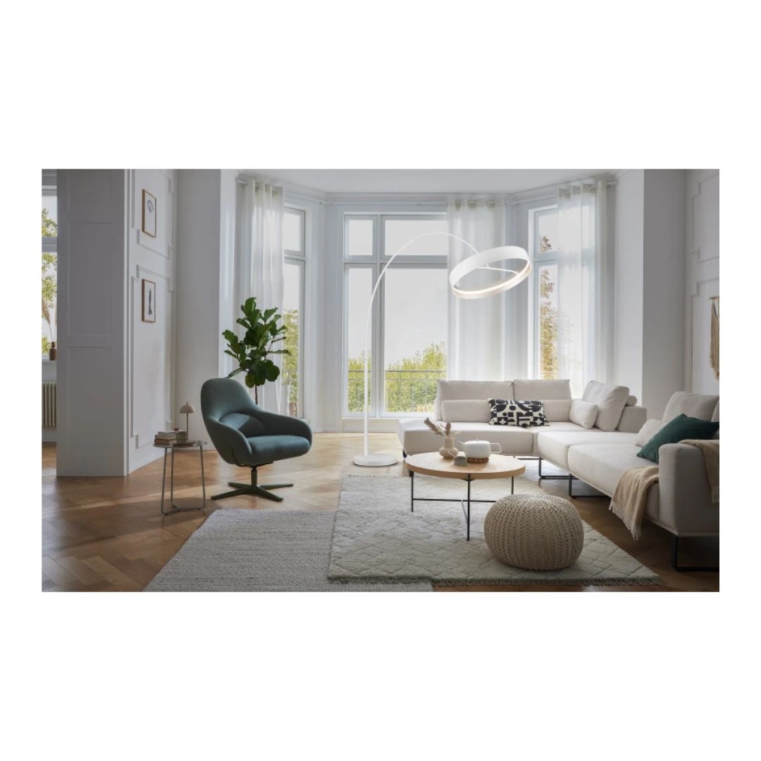 Loop gulvlampens rene design fås i sort eller hvid, hvilket gør den let at integrere i både moderne, minimalistiske og mere klassiske indretninger.