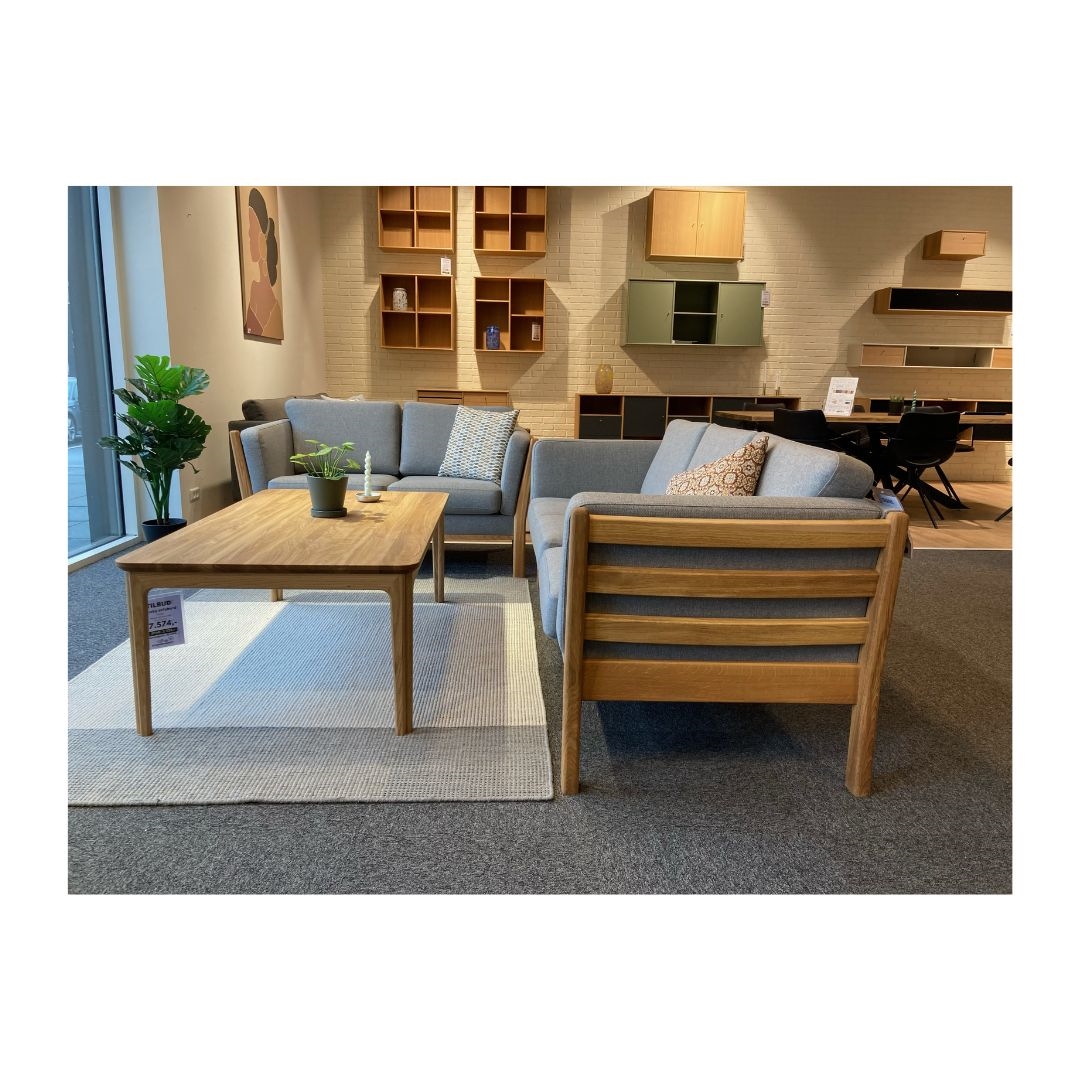 Flot kvalitetssofa fra danske Svane Design. Firenze sættet står her i massiv eg oliebehandlet og med et slidstærkt stykke gråt stof.
