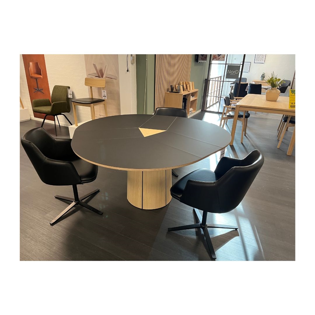 OUTLET - Skovby SM33 spisebord m/ indbygget plade - Sort nano laminat & Eg hvidolie - Mål: Ø123-149 cm.