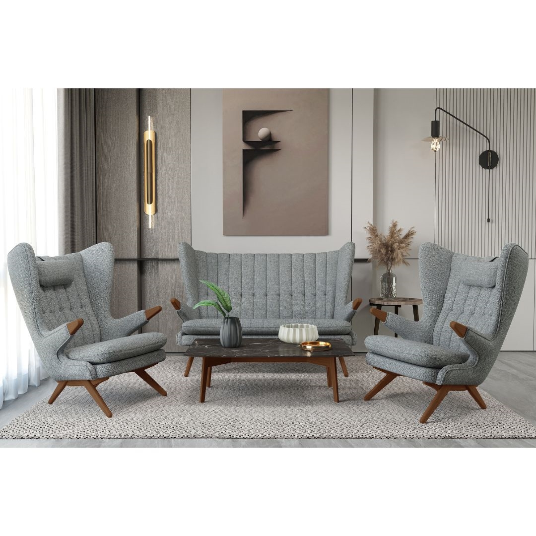 Tidløs designsofa i grå uld og valnød