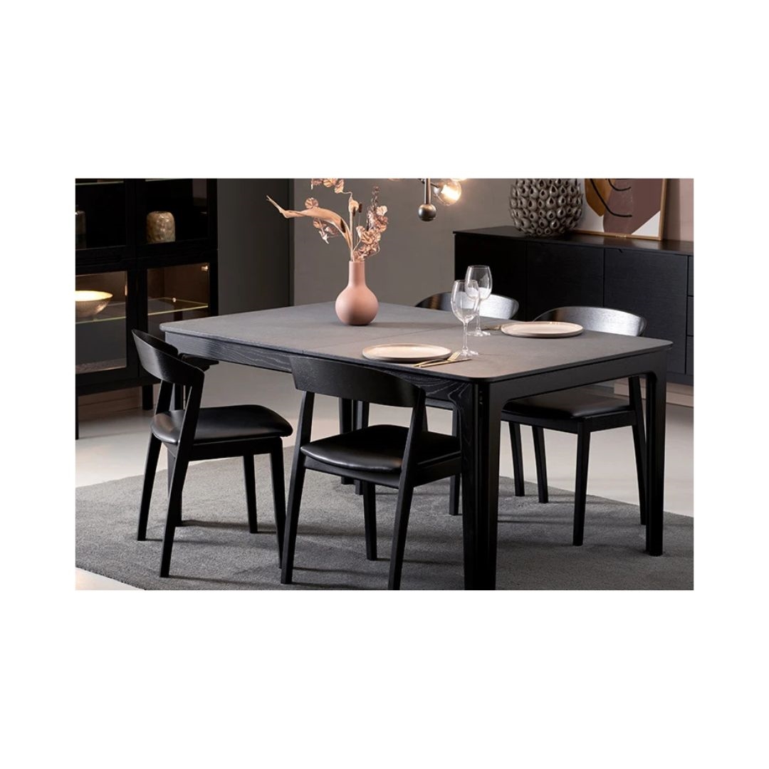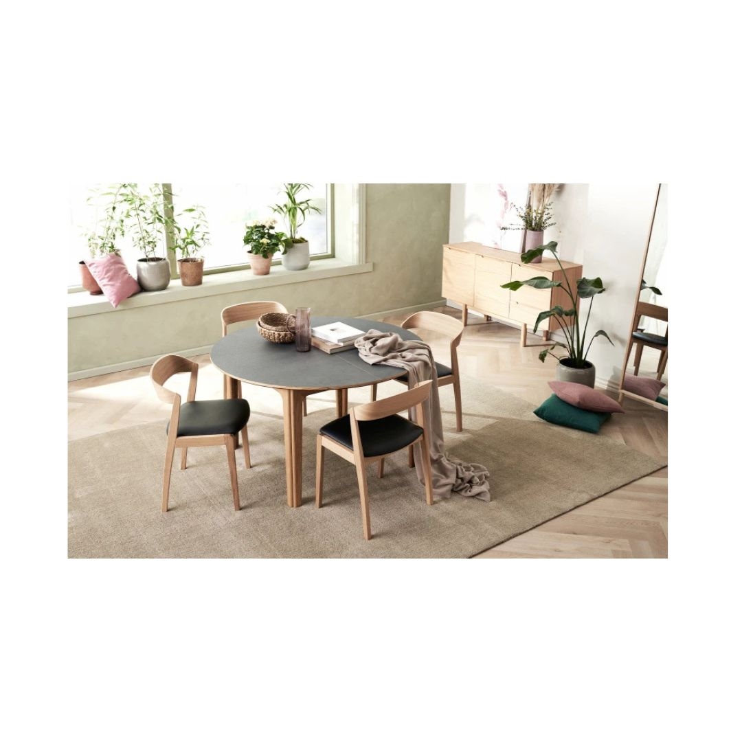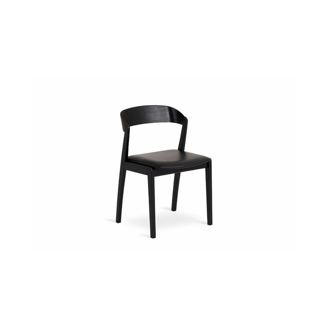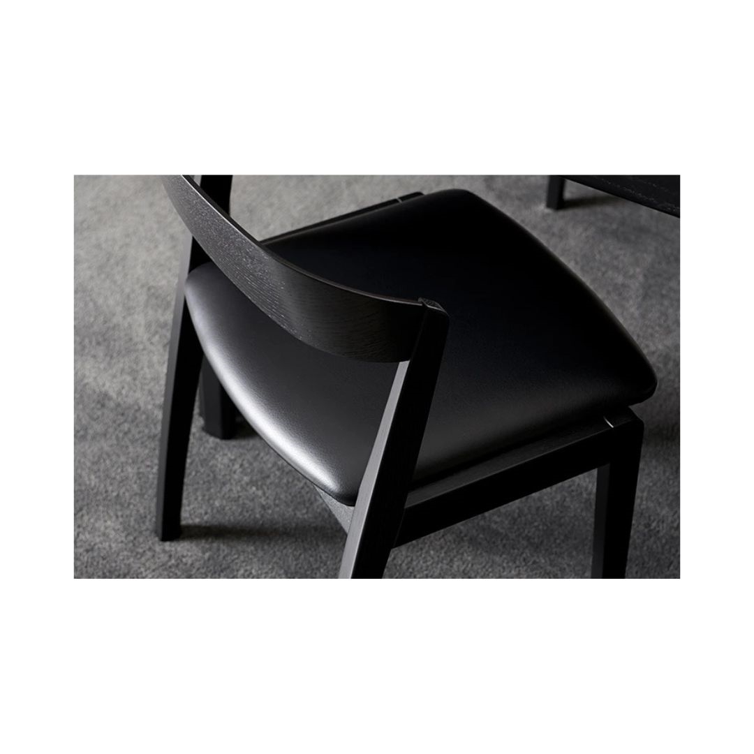 SM825 er fremstillet i massiv eg, hvor du kan vælge mellem to flotte varianter: naturolieret eg for et varmt og naturligt udtryk, eller sortbejdset eg for et mere grafisk og markant look. Sædet er betrukket med sort CC-læder, som tilføjer et eksklusivt touch og sikrer en behagelig siddeoplevelse.