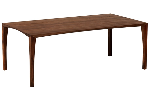 Inspirationen til bordets bløde linjer og karakteristiske fræsede kantprofil opstod under en togtur over Vejlefjordbroen, hvor broens elegante buer satte idéen i gang. Den svagt buede kant giver den 40 mm tykke bordplade et lettere, næsten svævende udtryk – en optisk finesse, der fremhæver bordets eksklusive karakter.