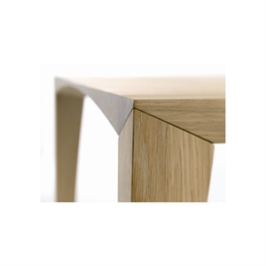 Et særligt teknisk højdepunkt er hjørnesamlingen, udviklet i samarbejde med Snedkergaarden. Her skjuler et specialdesignet beslag både samlingen og understøtter bordets stabilitet, så designet fremstår rent og elegant uden at gå på kompromis med styrken.
