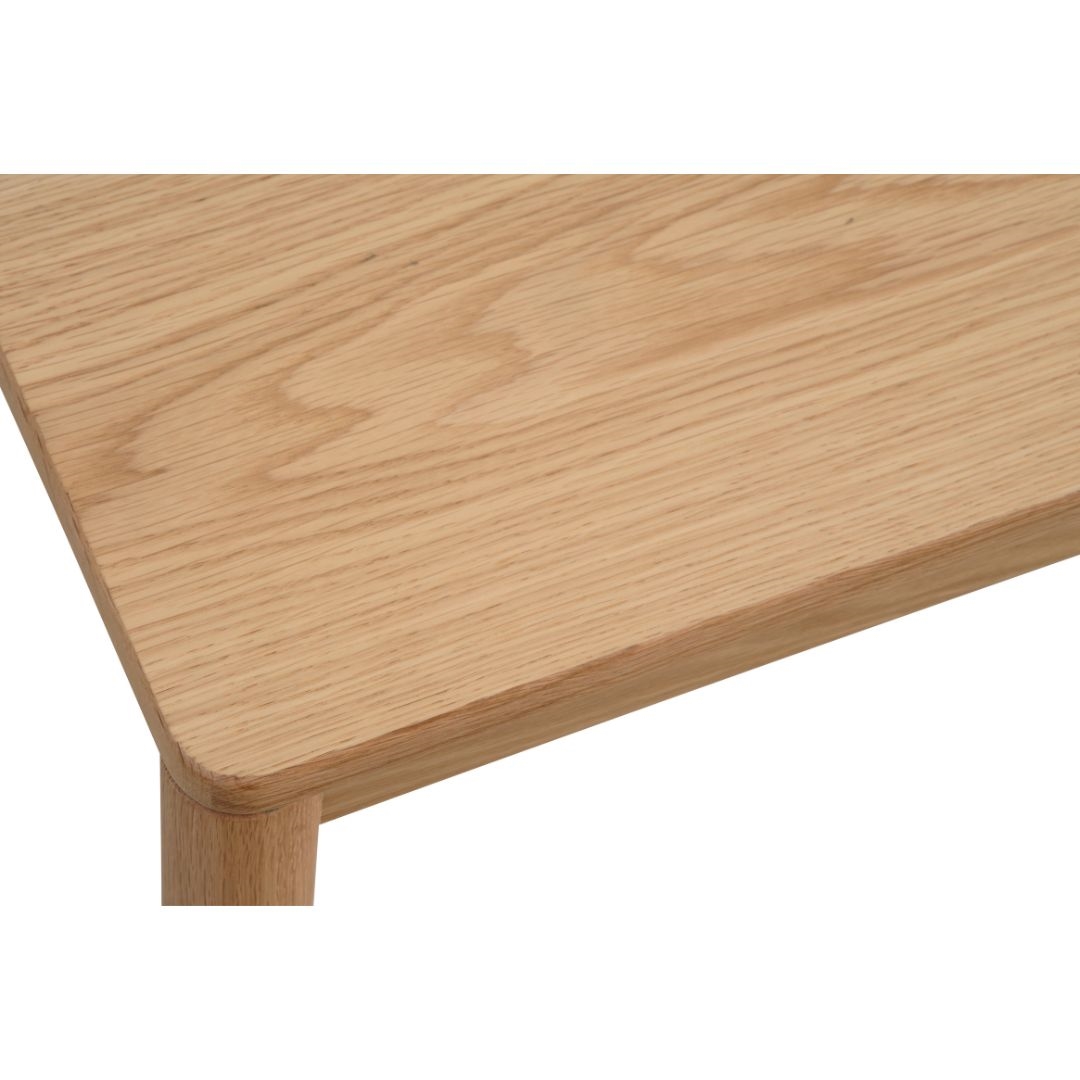 Den kvadratiske bordplade er lavet i slidstærkt egetræsfiner med massiv egetræskant, som understreger det naturlige udtryk. De fire ben i massivt egetræ giver stabilitet og et let udtryk, der fremhæver bordets tidløse design.