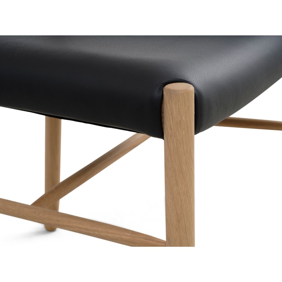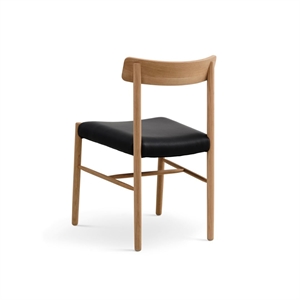 Stolen er udstyret med en sædehynde i blødt, slidstærkt semianilinlæder, som giver høj komfort og naturlig åndbarhed. Stellet i massiv eg sikrer stabilitet og lang holdbarhed – et kvalitetsmøbel, der både er funktionelt og æstetisk.
